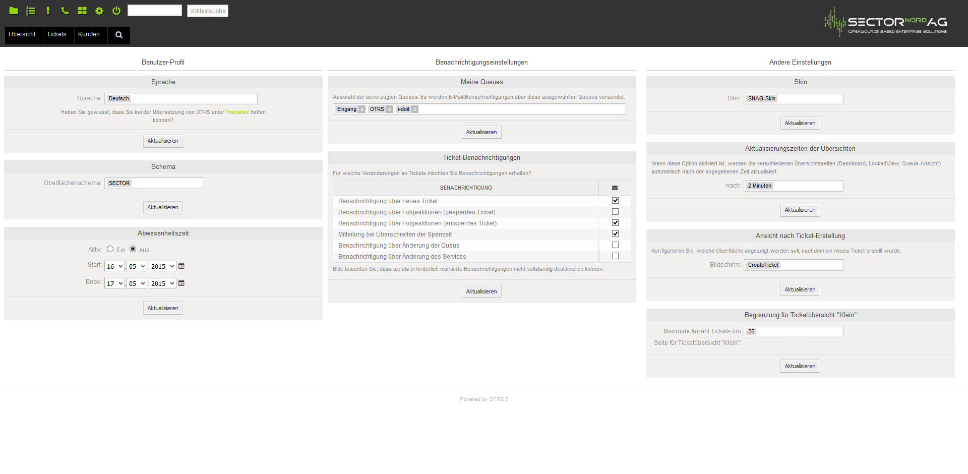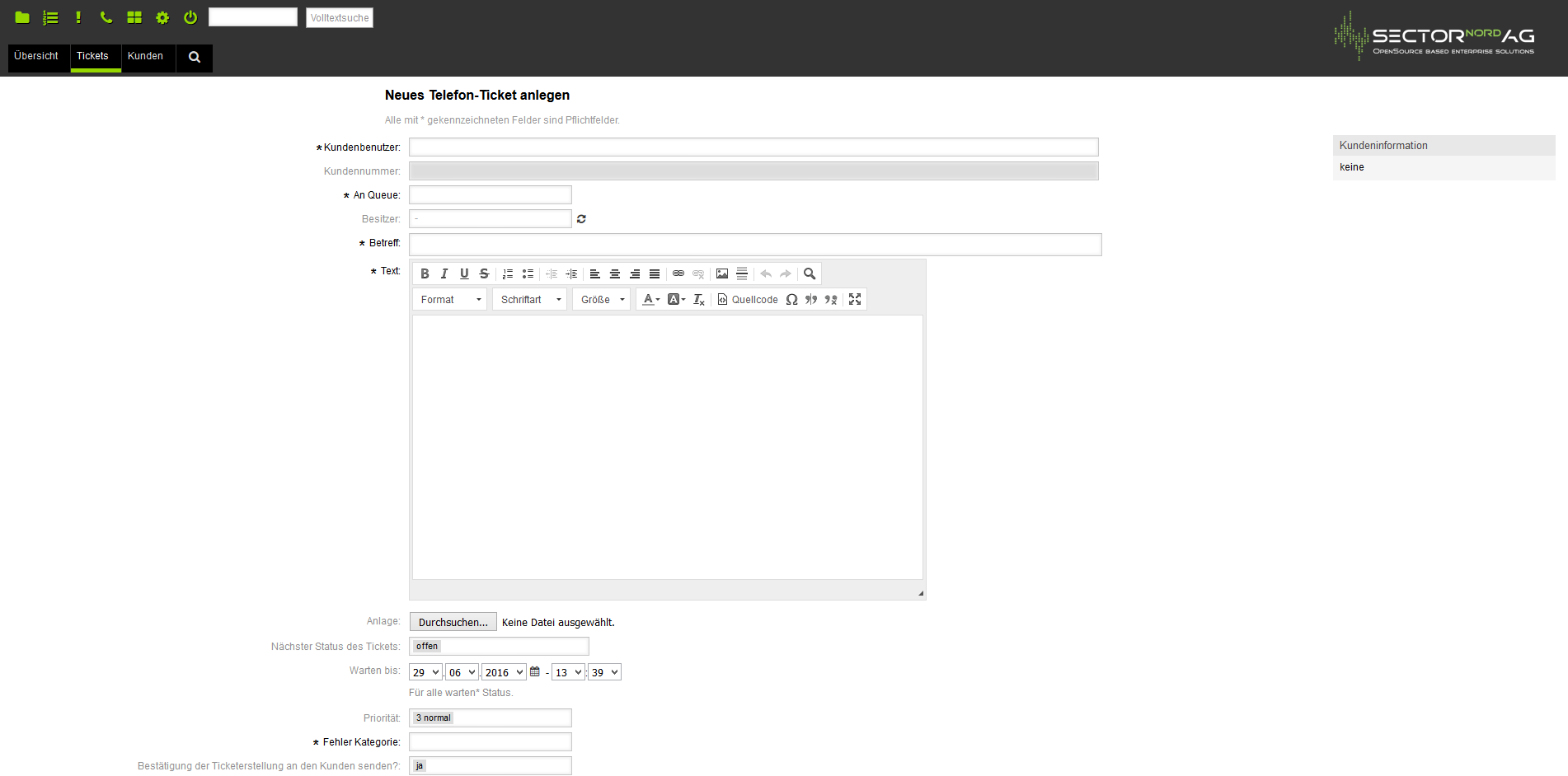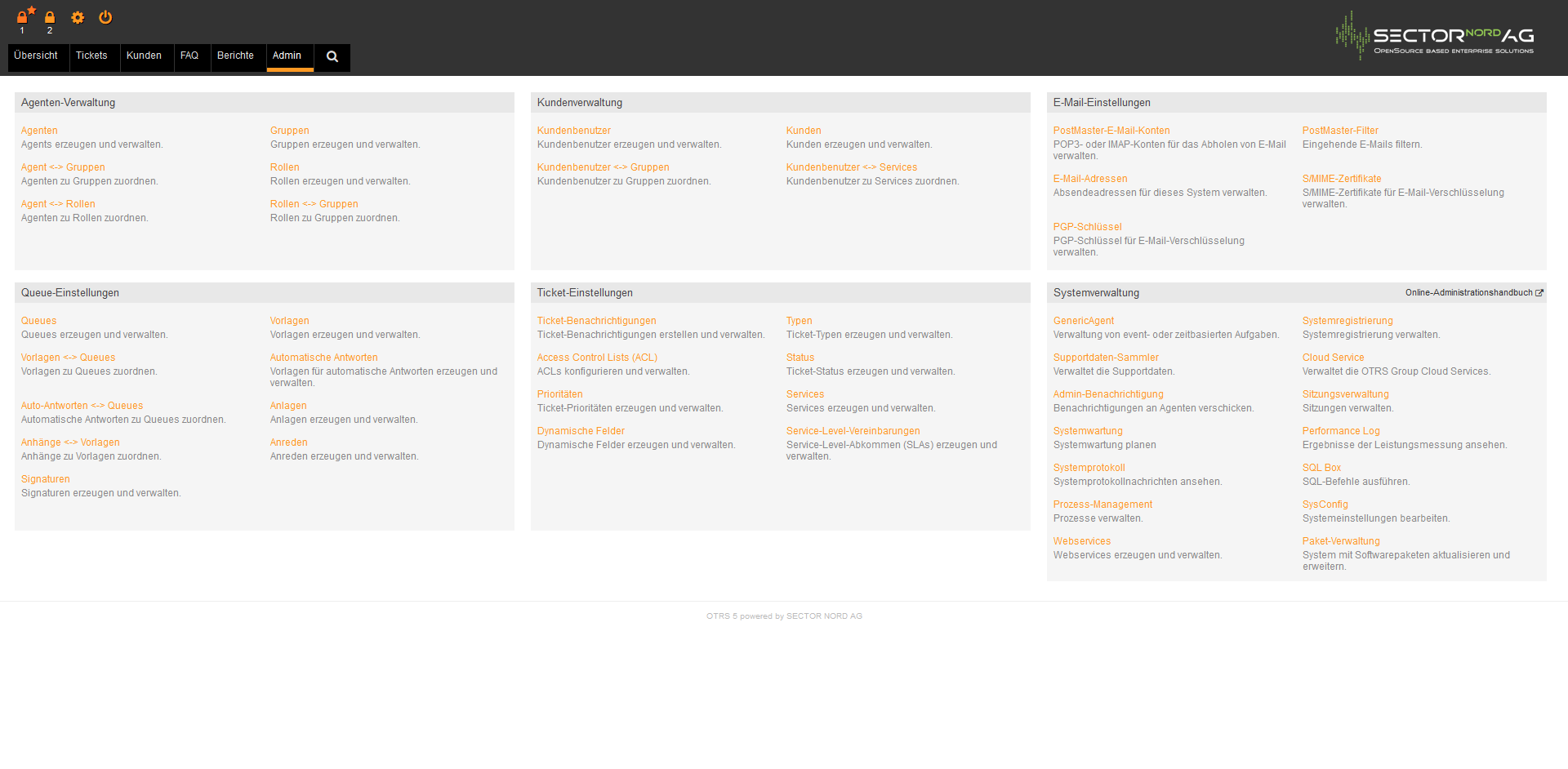 Znuny / ((OTRS)) CE ist ein in der Entwicklung sehr dynamisches und in der Handhabung sehr mächtiges Ticketsystem. Dabei werden verschiedene Medien wie Web, Mail, SMS unterstützt und bieten offene Schnittstellen zu anderen Systemen wie z. B. Kundendatenbanken.